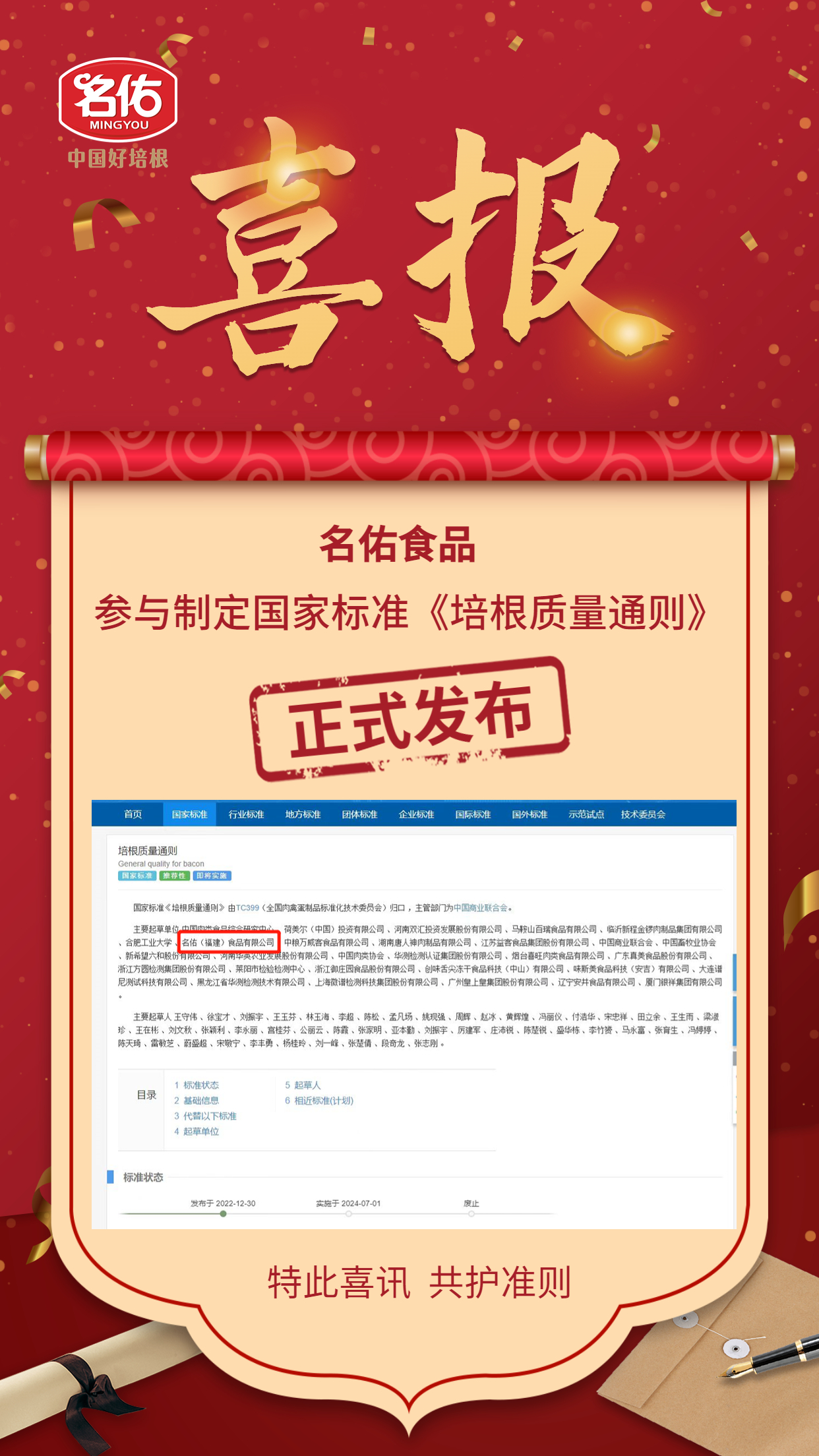 熱烈慶祝名佑食品參與制定國(guó)家標(biāo)準(zhǔn)《培根質(zhì)量通則》正式發(fā)布?。?!