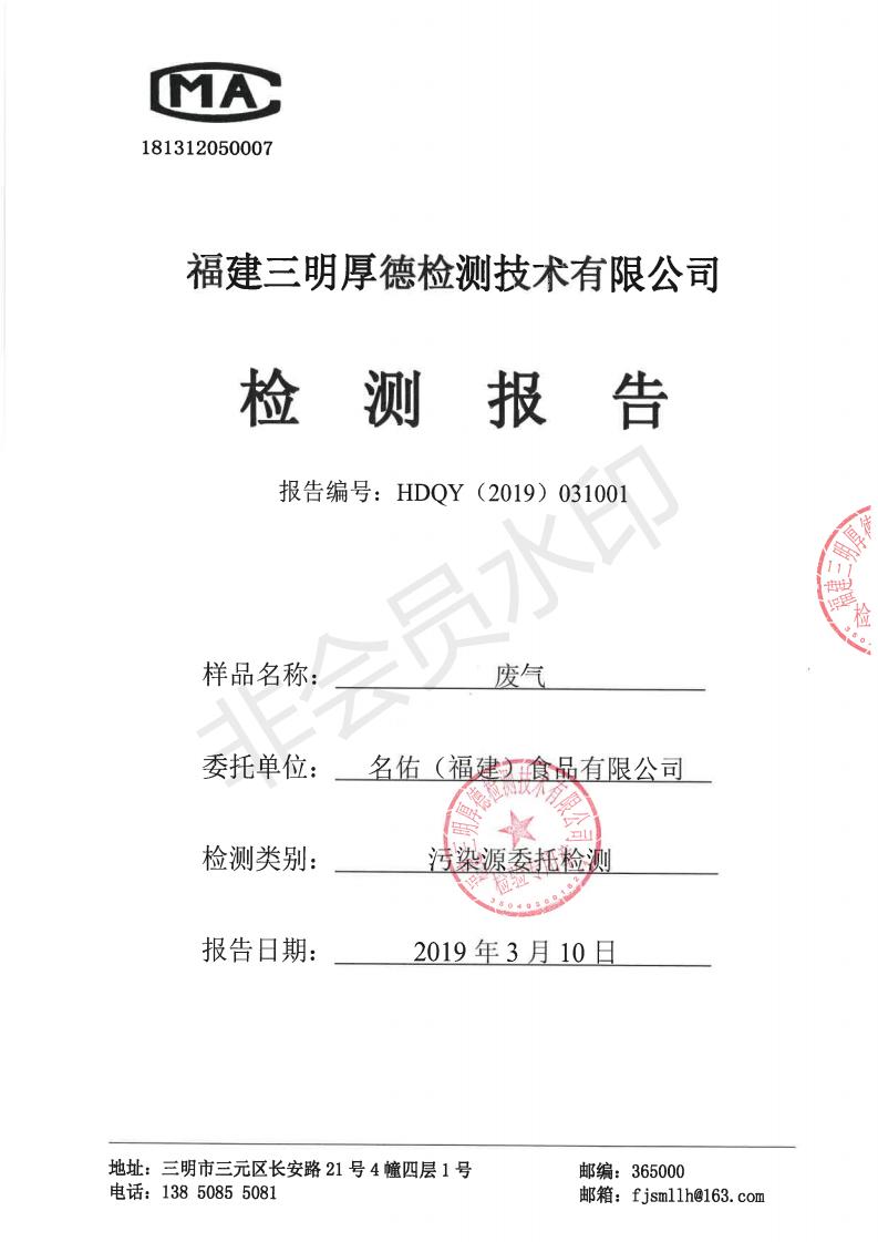 名佑(福建)食品有限公司2019年度3月環(huán)境自行監(jiān)測(cè)信息